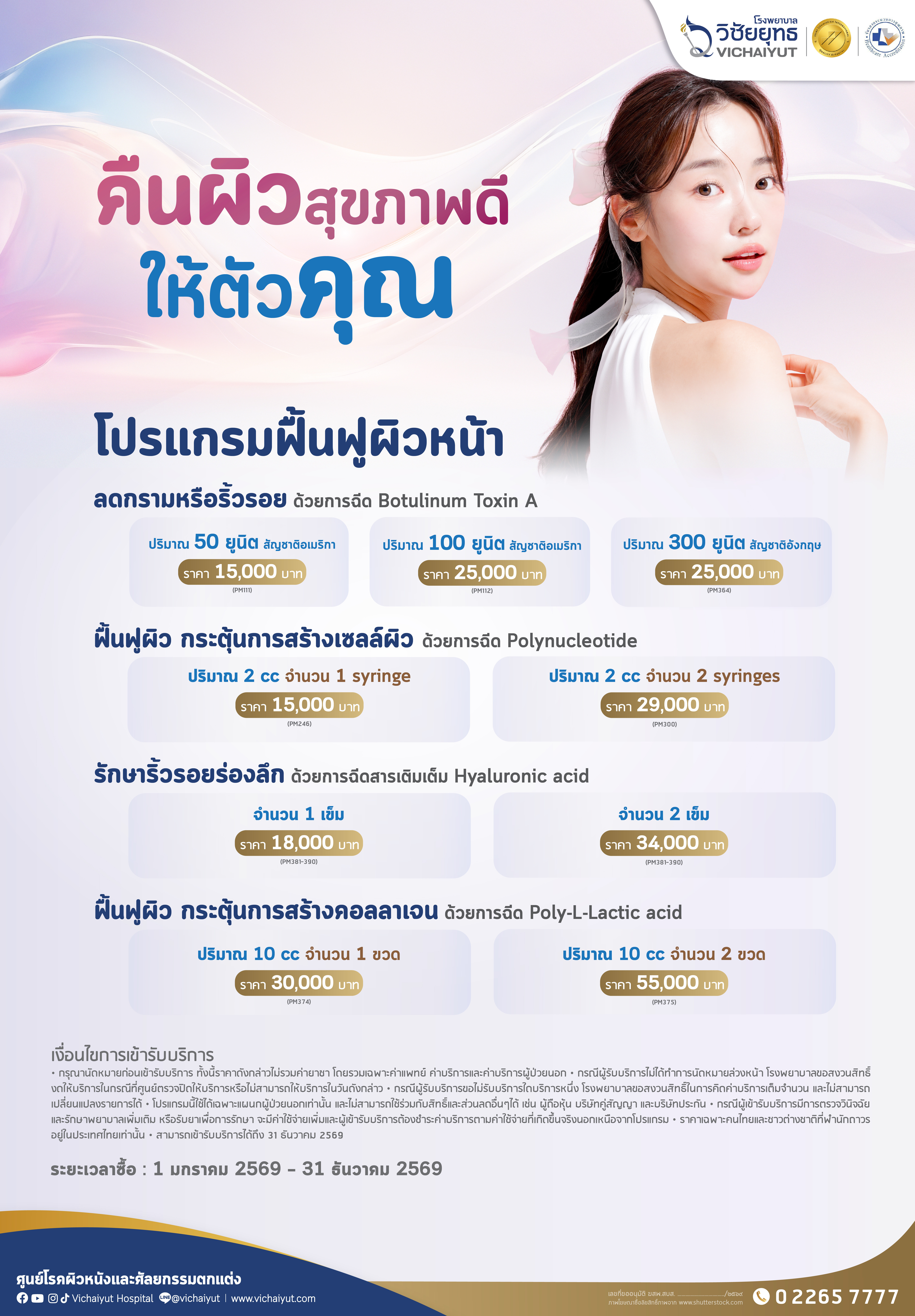 • This program can be transferred to the others. The patient is required to present the e-voucher with ID card before treatment at Skin and Cosmetic Center, 14th floor, Vichaiyut Medical Center. .