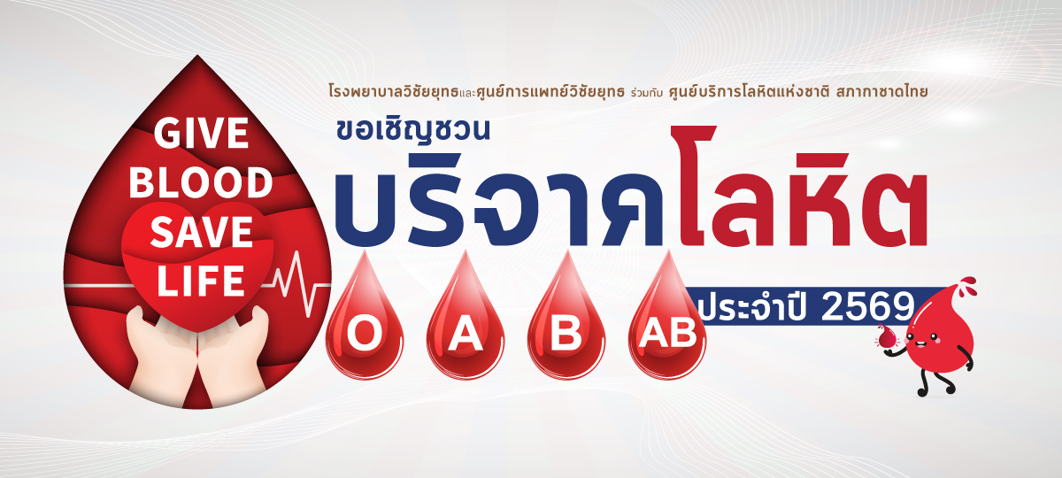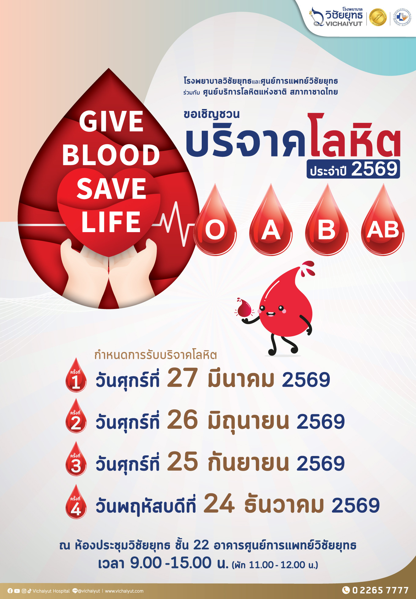 โรงพยาบาลวิชัยยุทธและศูนย์การแพทย์วิชัยยุทธร่วมกับศูนย์บริการโลหิตแห่งชาติ สภากาชาดไทย ขอเชิญชวนแพทย์ พยาบาล เจ้าหน้าที่ และบุคคลทั่วไป ร่วมกิจกรรมบริจาคโลหิต ประจำปี 2569 มาร่วมเป็นส่วนหนึ่งในการช่วยชีวิต ด้วยการบริจาคโลหิต สอบถามข้อมูลเพิ่มเติม โทร. 02265 7777
