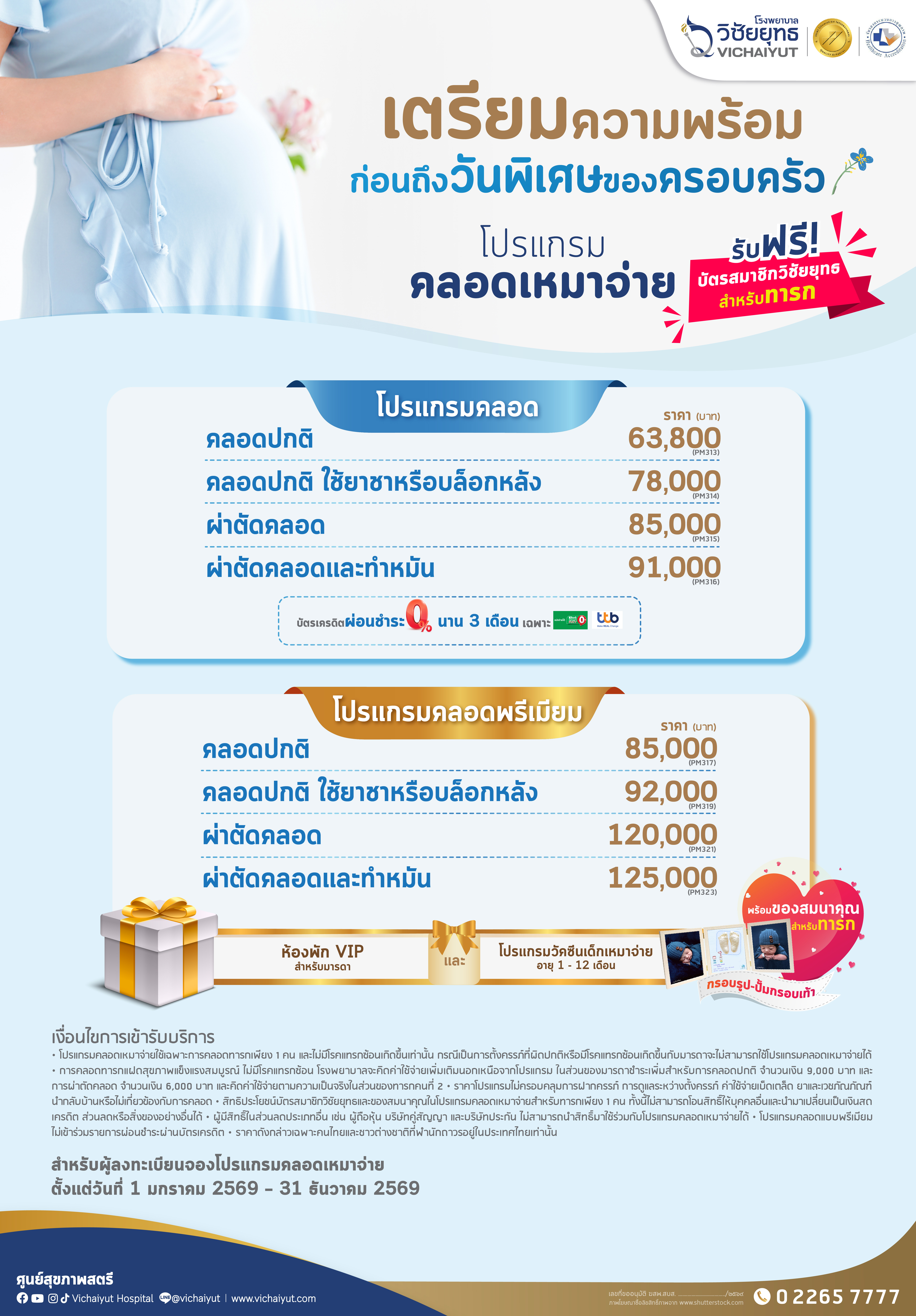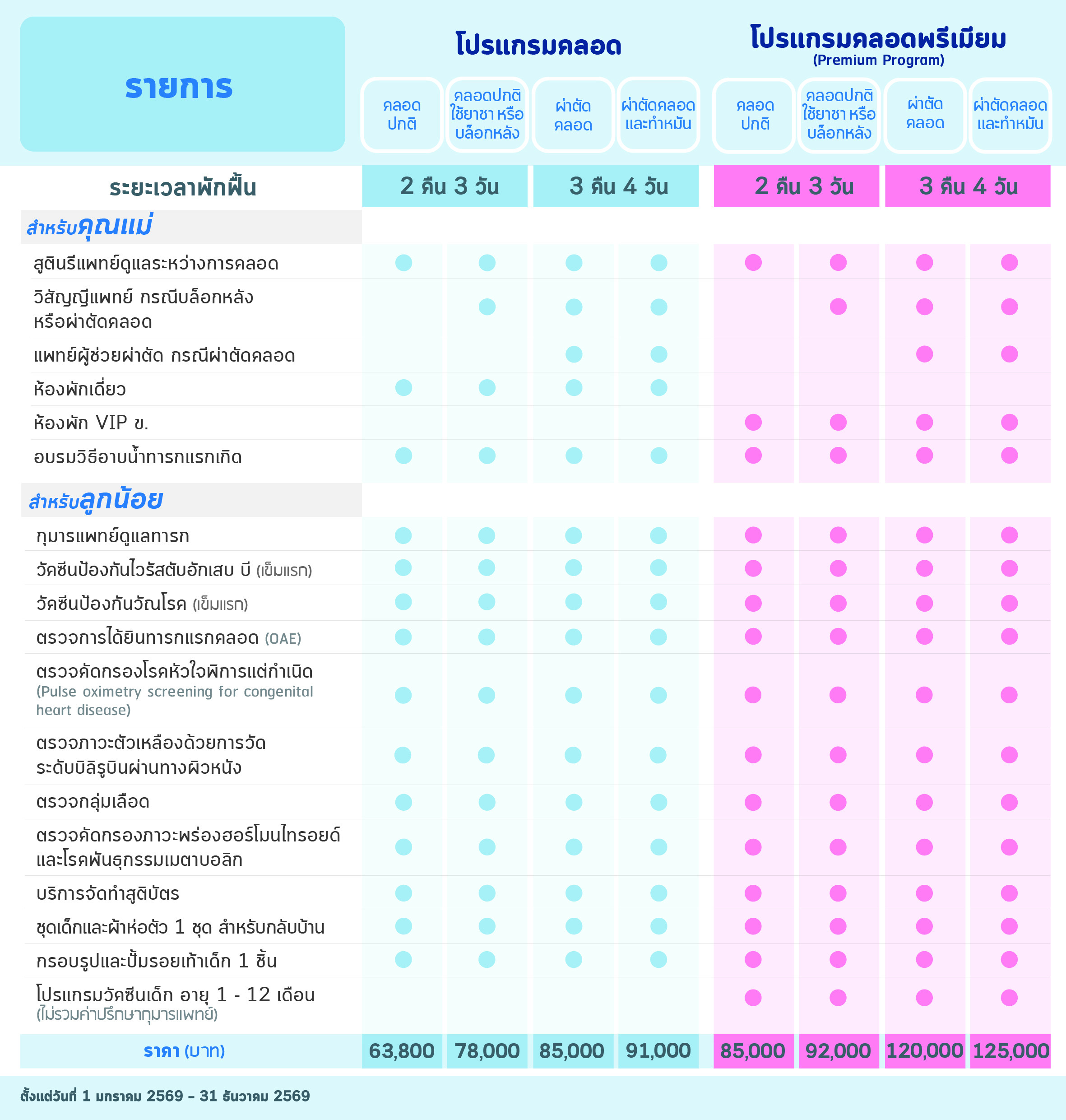 - โปรแกรมคลอดเหมาจ่ายสำหรับผู้ที่ฝากครรภ์ ตั้งแต่ 1 มกราคม 2569 – 31 ธันวาคม 2569
