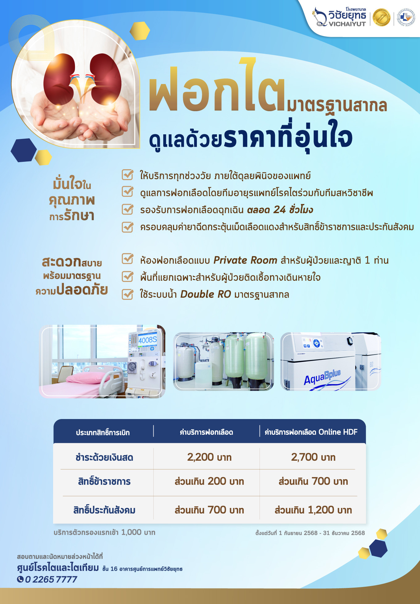 โรพยาบาลวิชัยยุทธให้บริการบริการฟอกไตด้วยทีมอายุรแพทย์โรคไตร่วมกับทีมสหวิชาชีพ ภายใต้มาตรฐานความปลอดภัยระดับสากล พร้อมห้องฟอกเลือดแบบ Private Room และระบบน้ำสะอาด Double RO รองรับบริการฟอกเลือดฉุกเฉินตลอด 24 ชั่วโมง ค่าบริการเริ่มต้น 2,200 บาท ตั้งแต่ 1 กันยายน – 31 ธันวาคม 2568 ศูนย์โรคไตและไตเทียม ชั้น 16 อาคารศูนย์การแพทย์วิชัยยุทธ โทร. 02265 7777