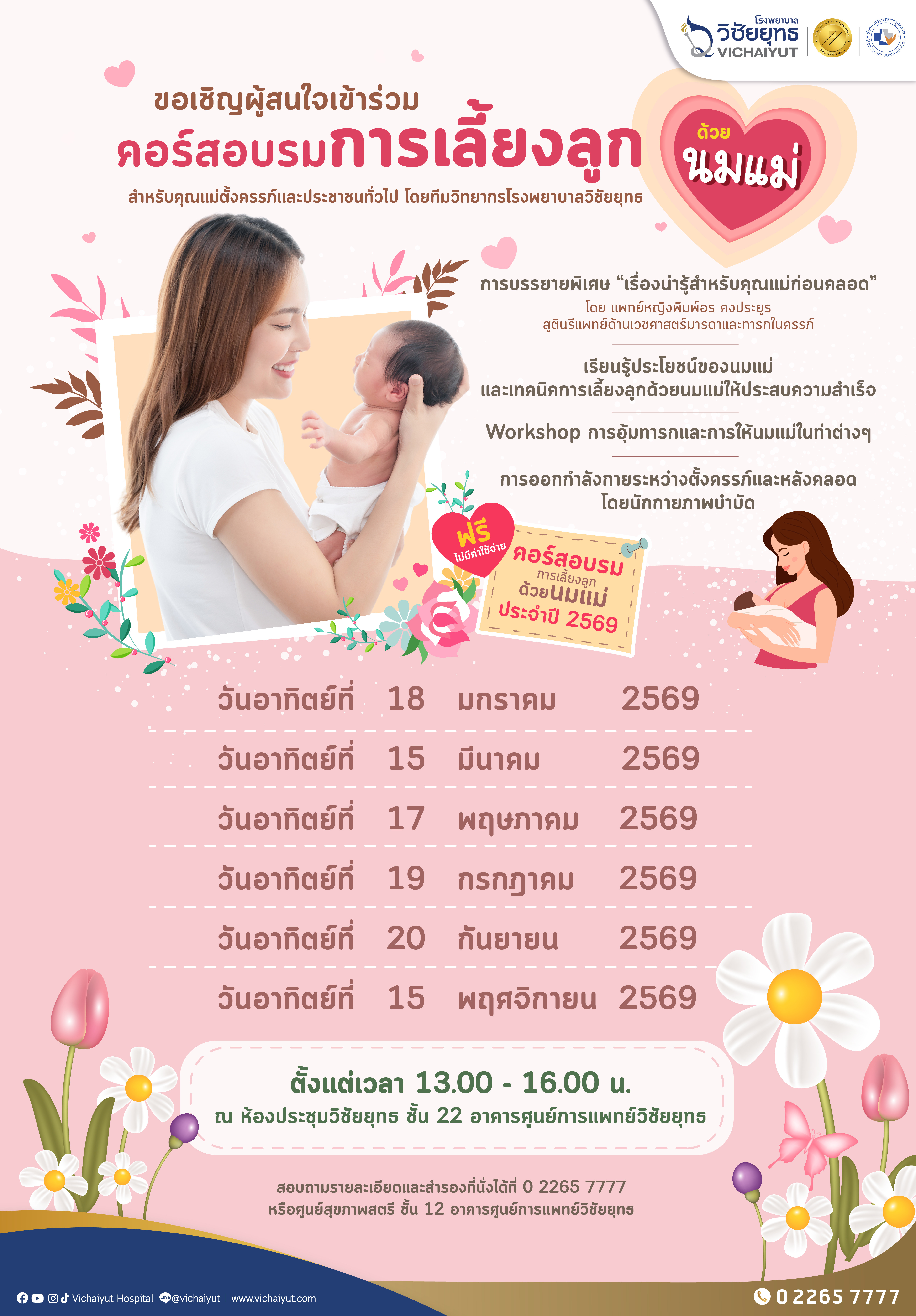 ศูนย์สุขภาพสตรี โรงพยาบาลวิชัยยุทธขอเชิญผู้สนใจร่วมกิจกรรมคอร์สอบรม"การเลี้ยงลูกด้วยนมแม่" ประจำปี 2569 ฟรี! ไม่มีค่าใช้จ่าย สำหรับคุณแม่ตั้งครรภ์และประชาชนทั่วไป โดยทีมวิทยากรโรงพยาบาลวิชัยยุทธ ภายในคอร์สอบรมมีกิจกรรม อาทิ การบรรยายพิเศษ "เรื่องน่ารู้สำหรับคุณแม่ก่อนคลอด" / การเรียนรู้ประโยชน์ของแม่และเทคนิคการเลี้ยงลูกด้วยนมแม่ให้ประสบความสำเร็จ / Workshop การอุ้มทารกและการให้นมแม่ในท่าต่างๆ รวมทั้งการออกกำลังกายระหว่างตั้งครรภ์และหลังคลอด โดยนักกายภาพบำบัด